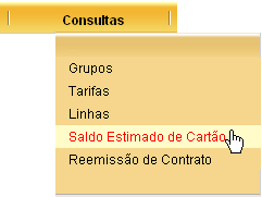 Você pode consultar o saldo estimado do cartão selecionando a opção: CONSULTAS à SALDO ESTIMADO DE CARTÃO.