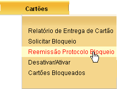 Você pode reemitir o protocolo de bloqueio de cartão selecionando a opção CARTÕES à REEMISSÃO DE PROTOCOLO DE BLOQUEIO.